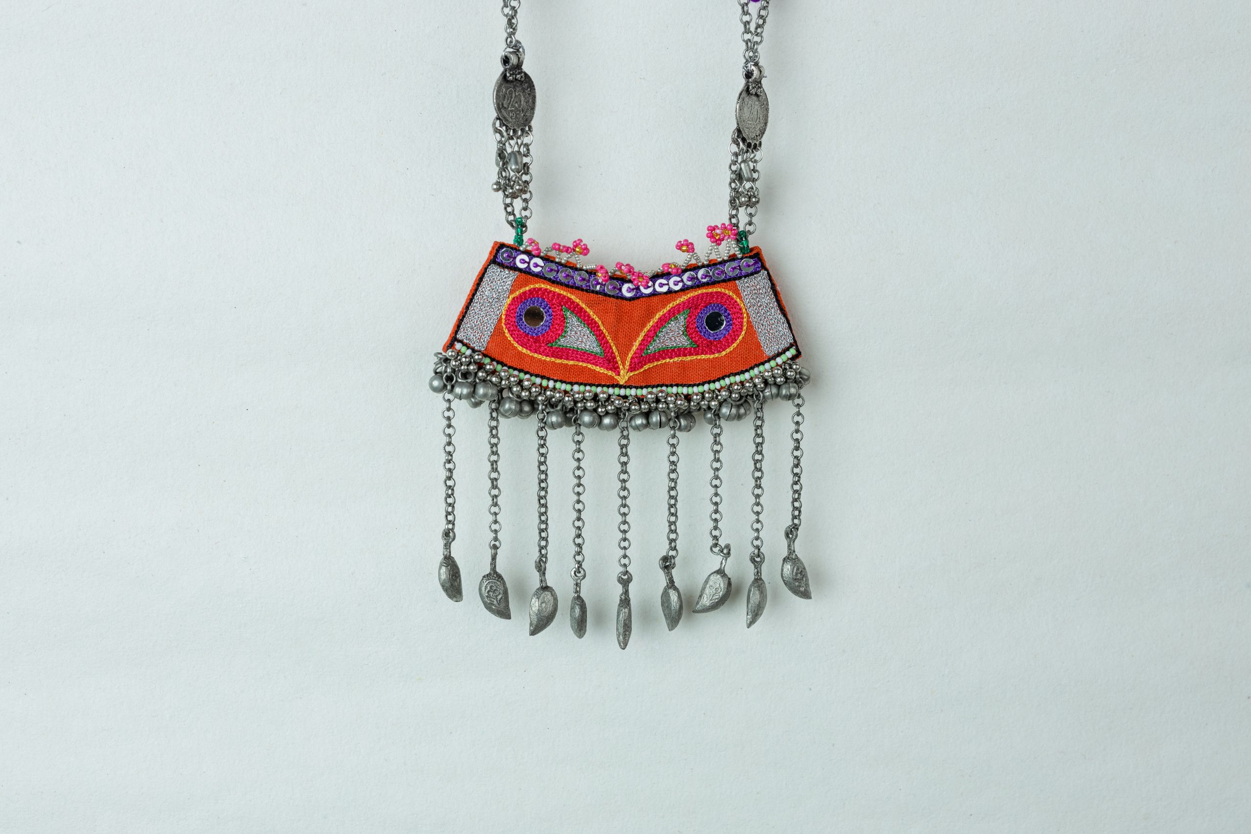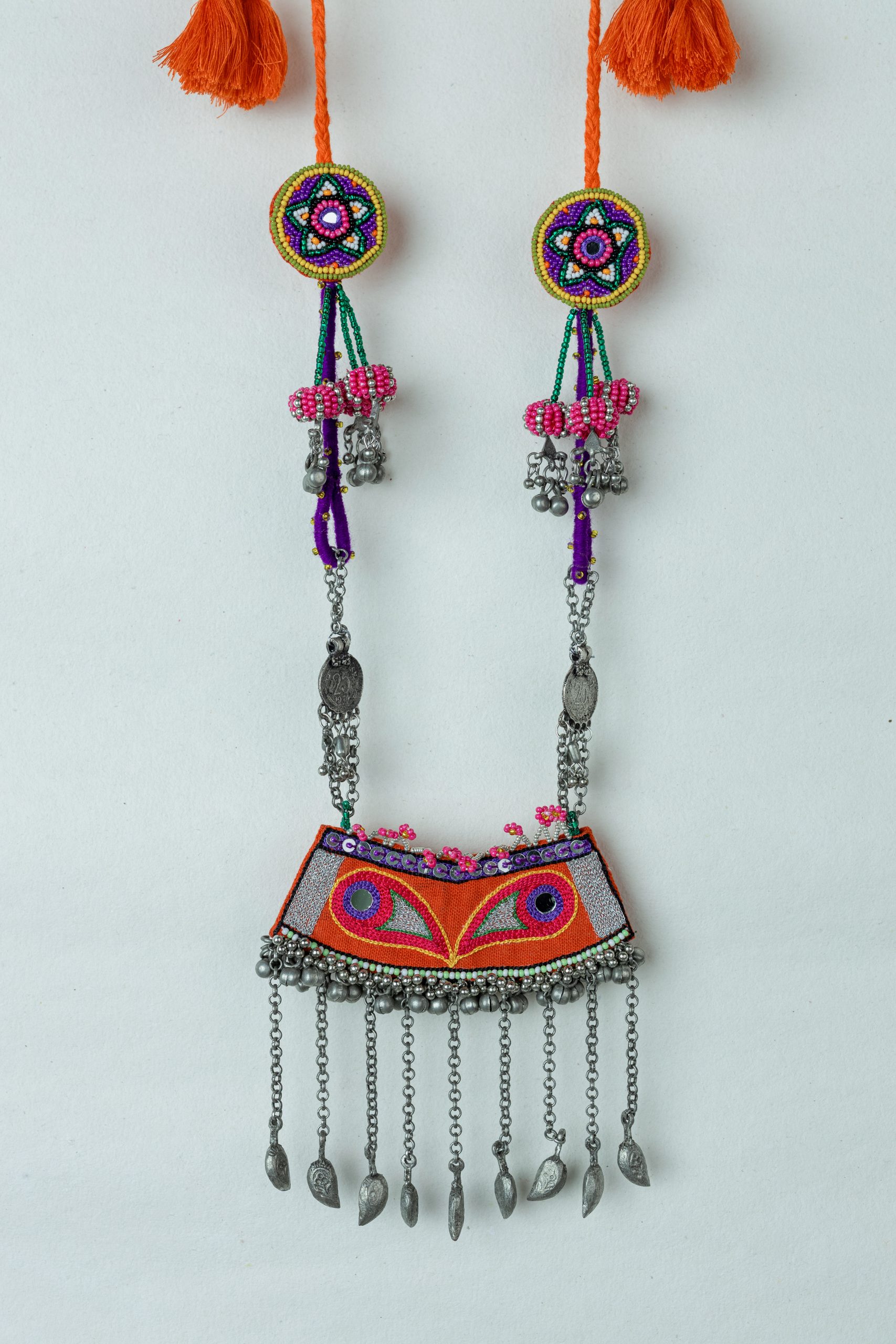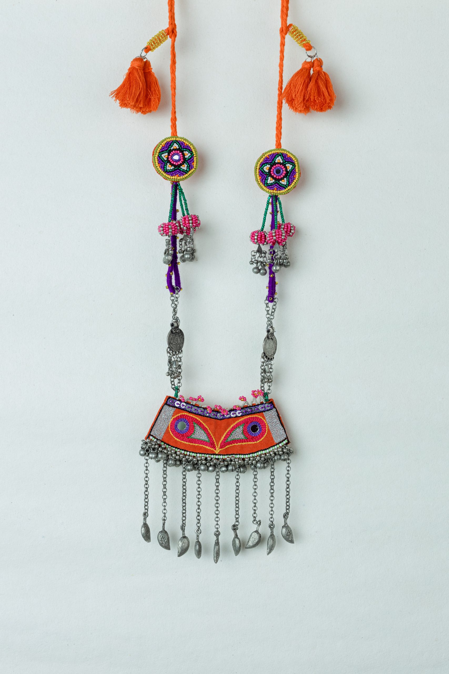 A simple yet unique neckpiece that is perfect for a casual or festive look, designed with a beautiful pendant. Introducing our Jokham neckpiece with our unique motifs and embroidery. Light weight and easy to carry. Provided with a thread to tie on the back.