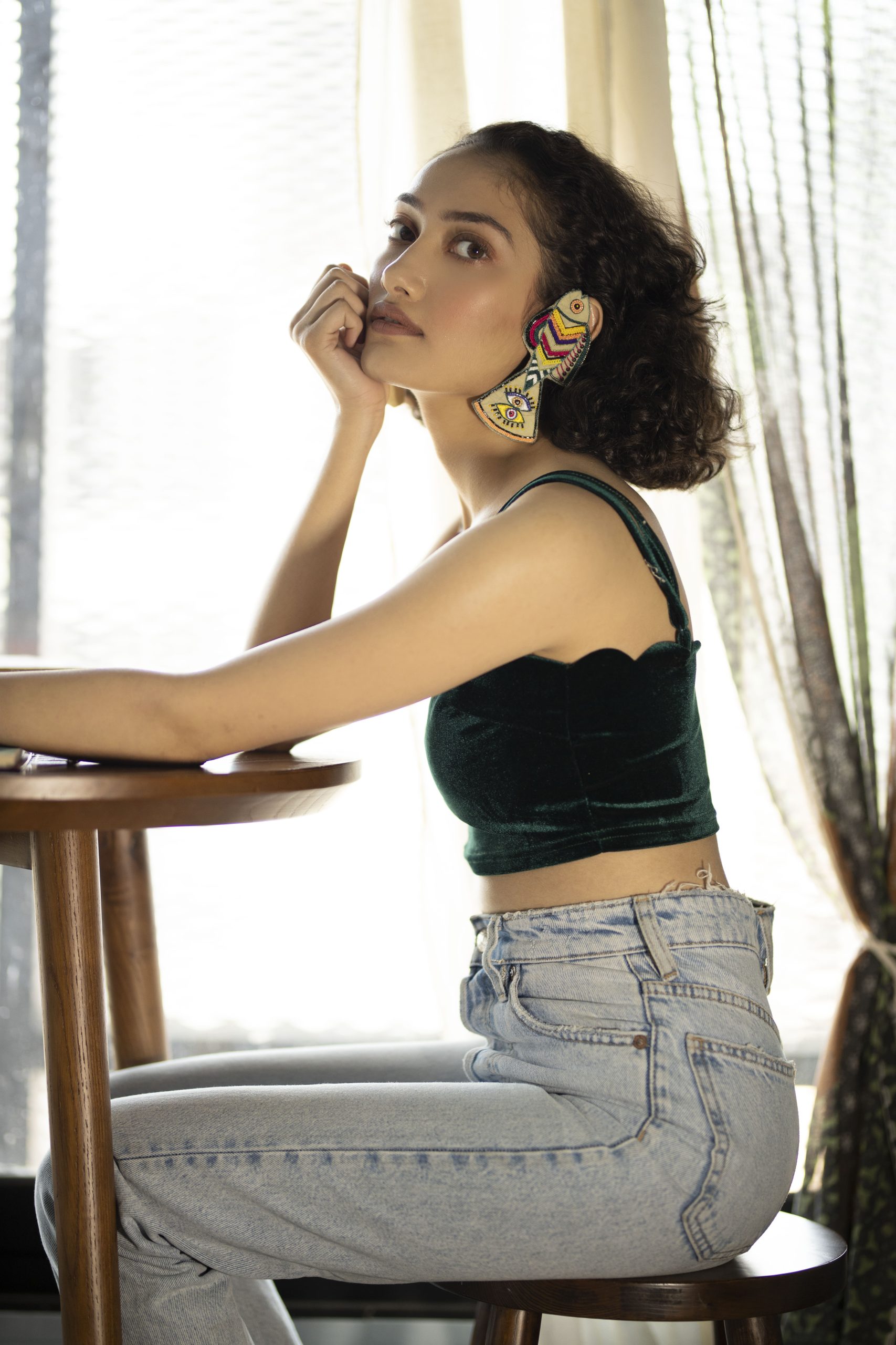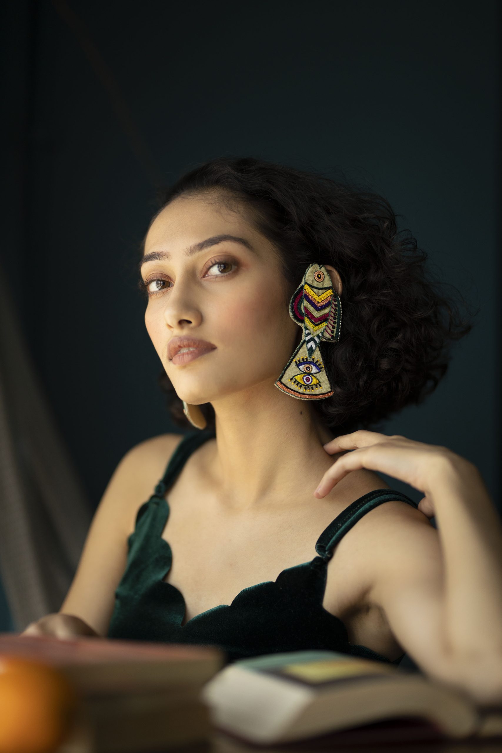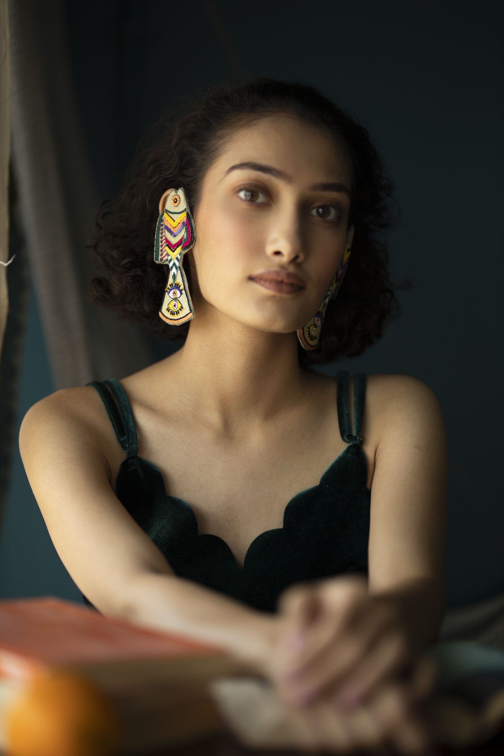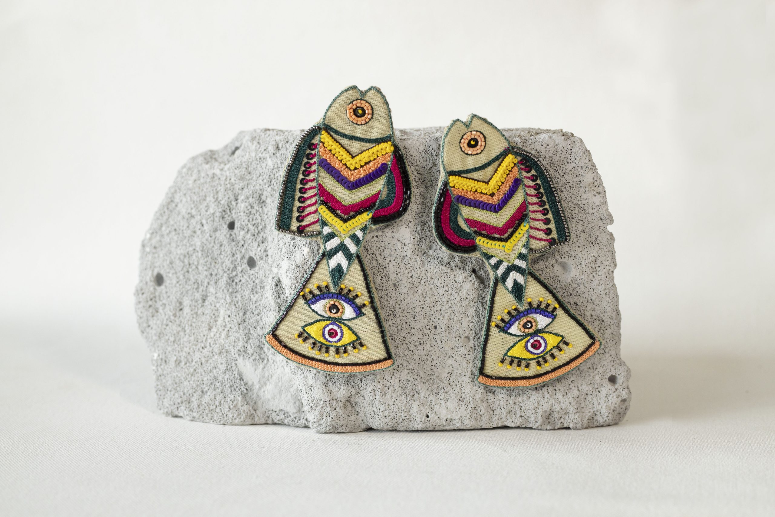 Handmade and hand-embroidered earcuffs with our unique and intricately designed fish. Embroidered with silk threads and beads. Earrings are provided with a metal chain at the back to hold the earcuffs straight as shown in the model picture. Lightweight and easy to carry. Provided with a stud at the back.