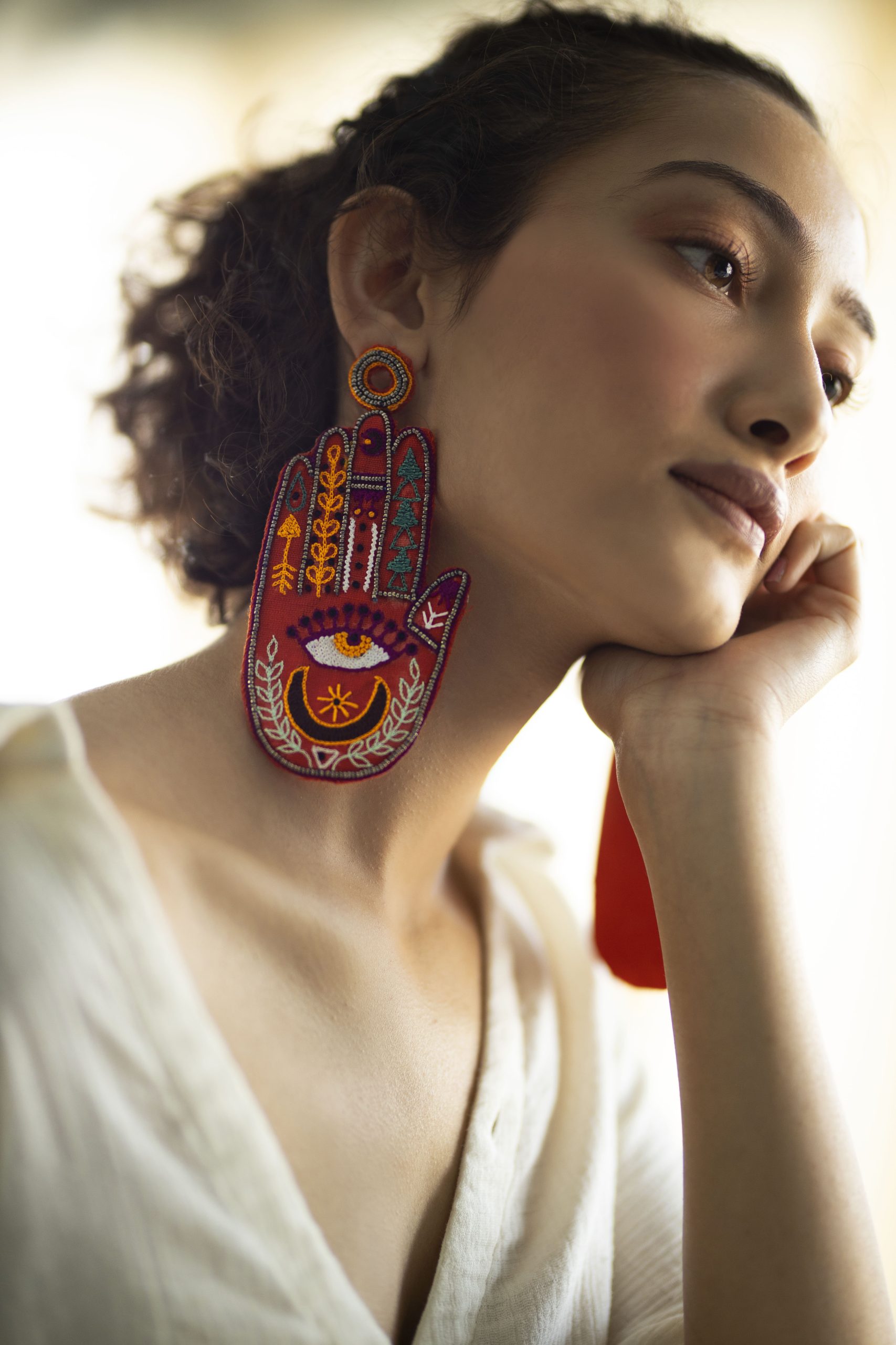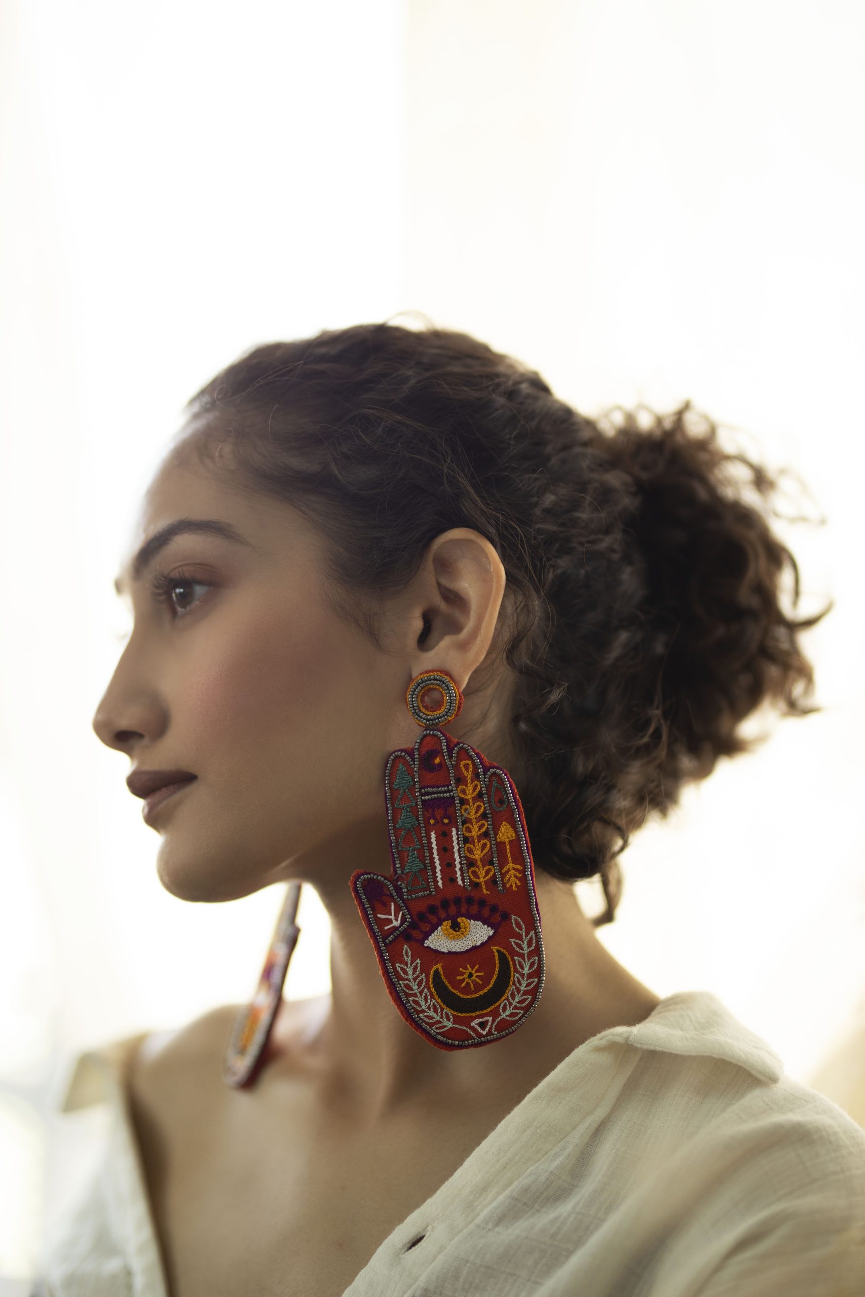 Handmade and hand-embroidered statement earrings with our unique hamsa hand design. Embroidered with silk threads and beads. Lightweight and easy to carry. Provided with a stud at the back.