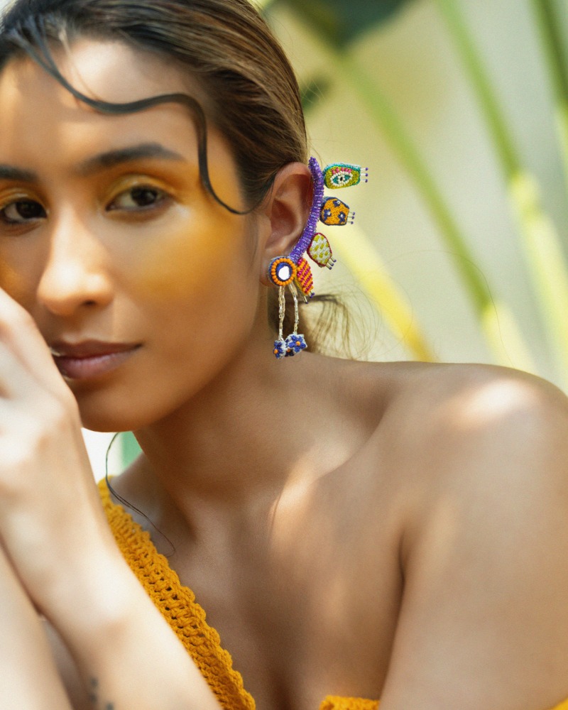 This summer we bring to you some intricately and uniquely handcrafted earrings that can make heads turn. The earrings have beautiful beads detailing in embroidery and hanging which gives it a quirky look. Earrings are lightweight and easy to carry. Provided with a stud at the back, and a hook on top to hold.