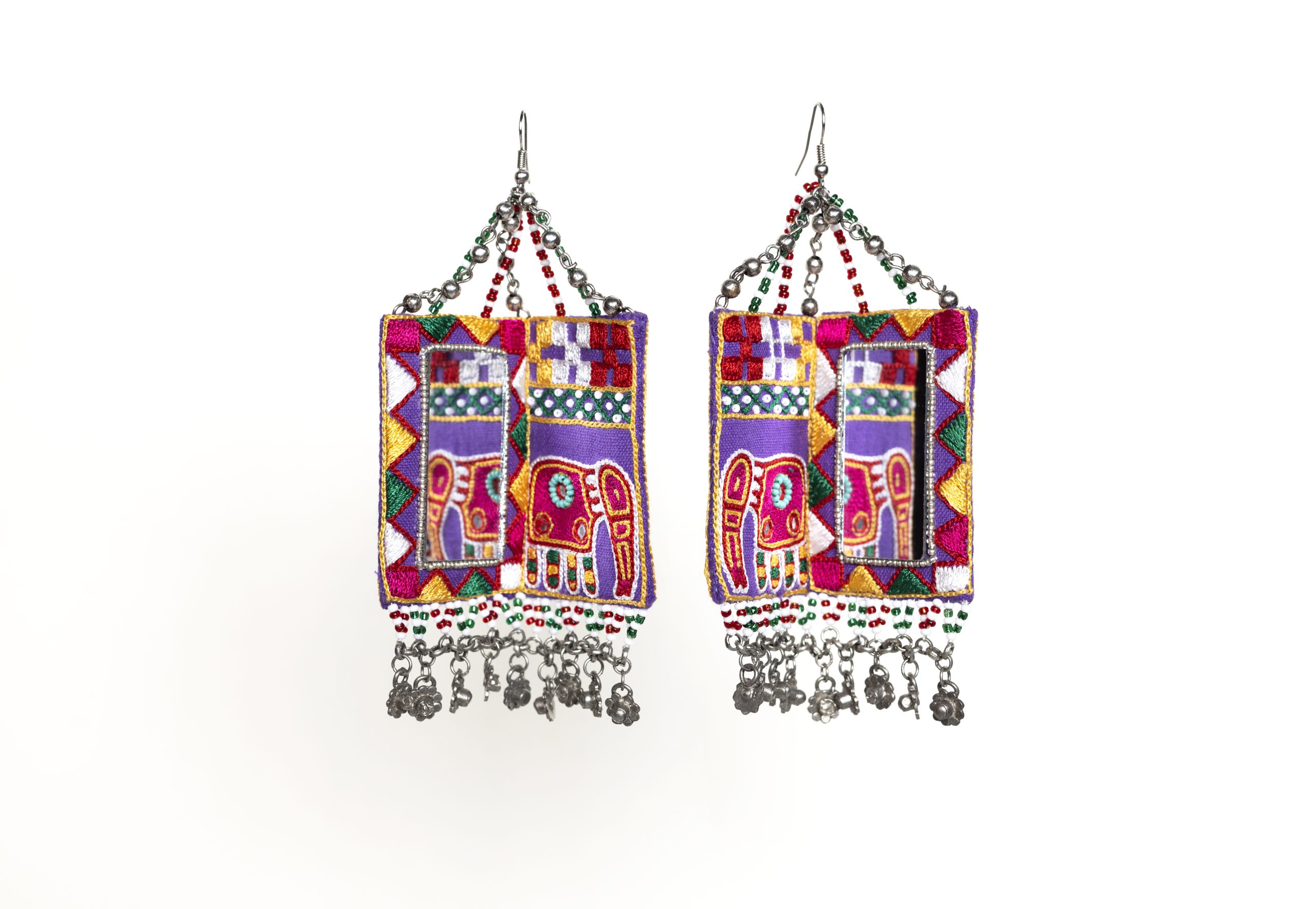 Exclusive handcrafted earrings with our traditional Indian motifs and bead hanging, specially designed for the Navratri and Durga Pooja festivals. Embroidered elephant motif on one side and embroidered mirror on 2nd side of an earring, for giving a reflection of the elephant in a mirror. Lightweight and easy to carry. Provided with a hook on top.