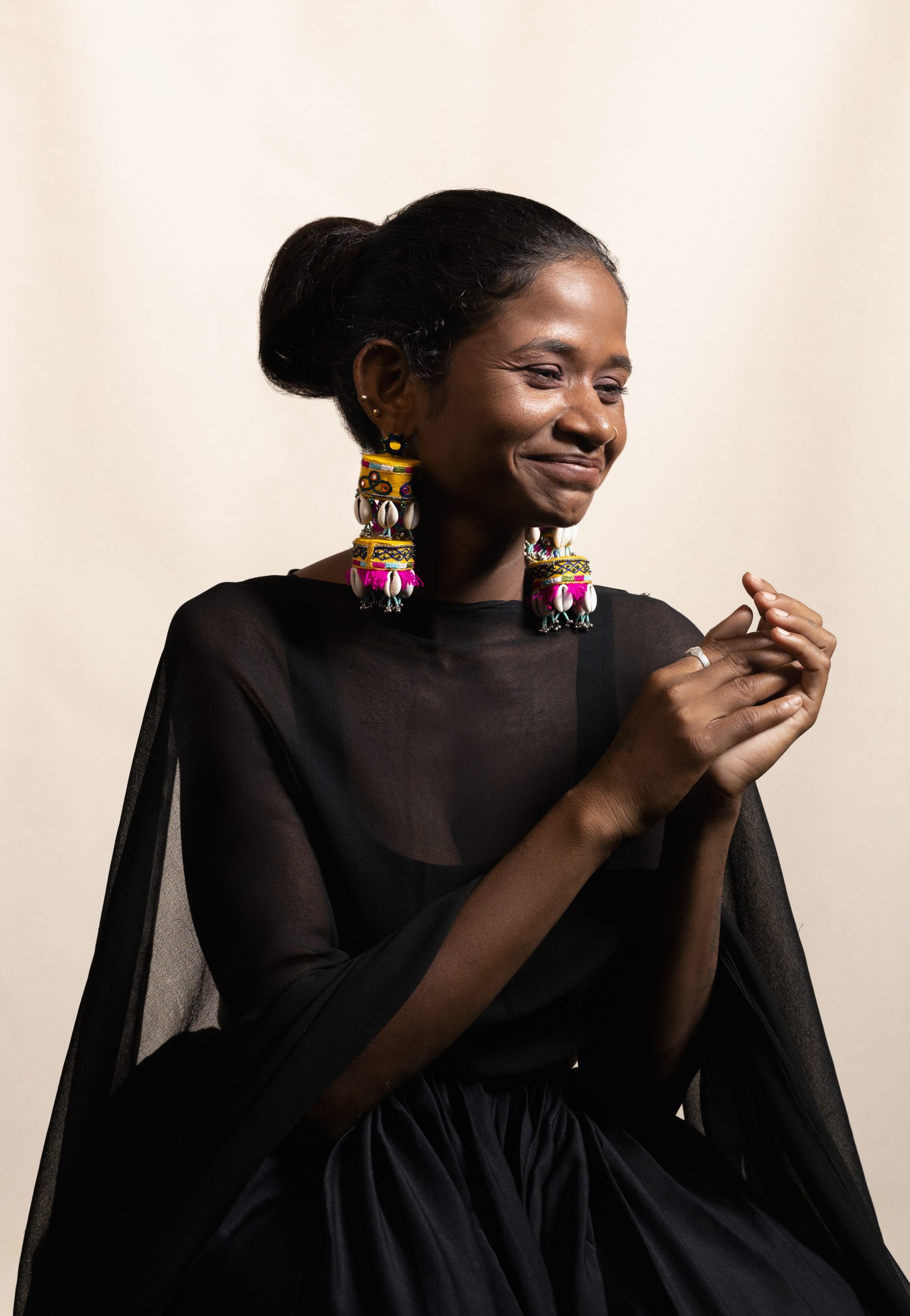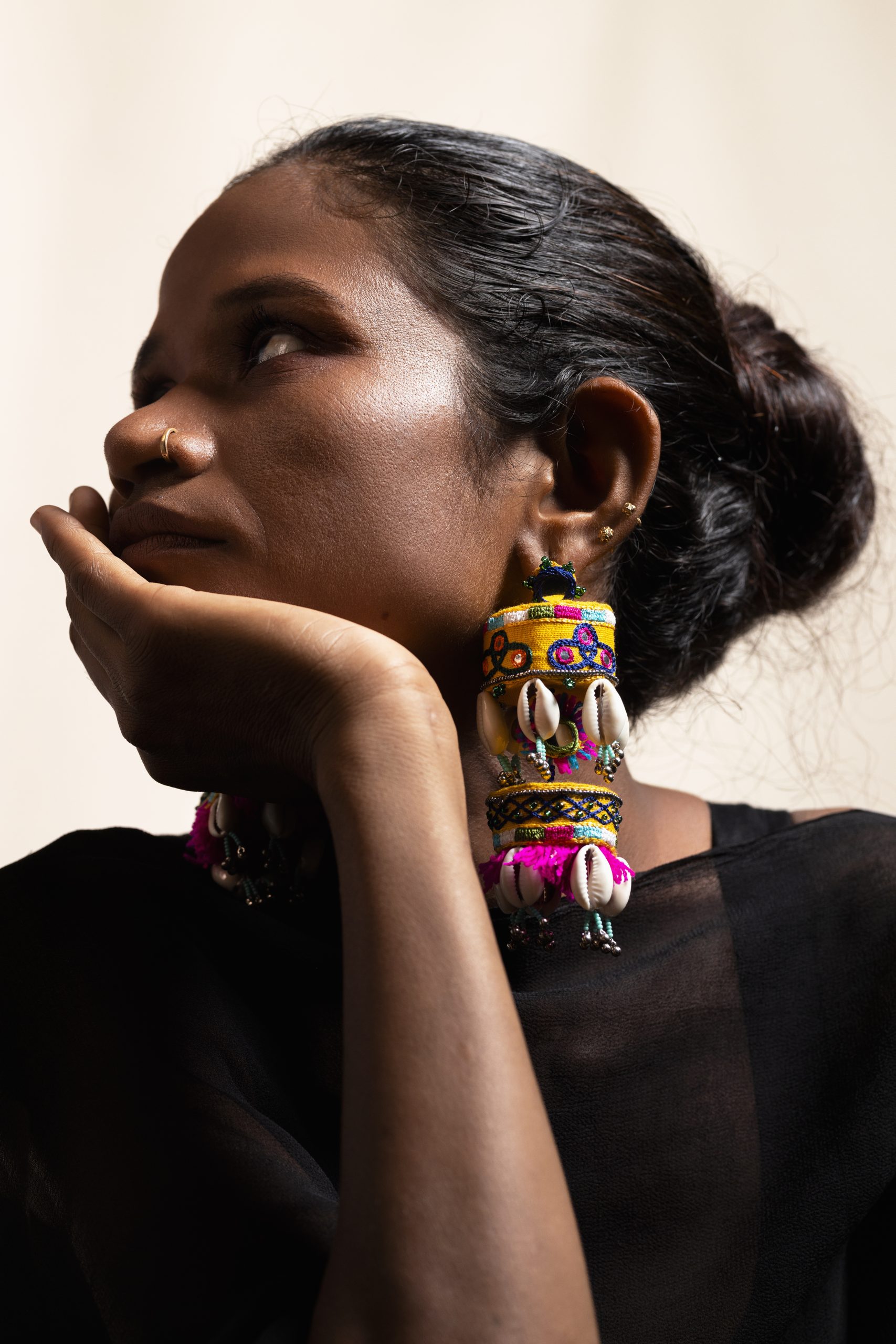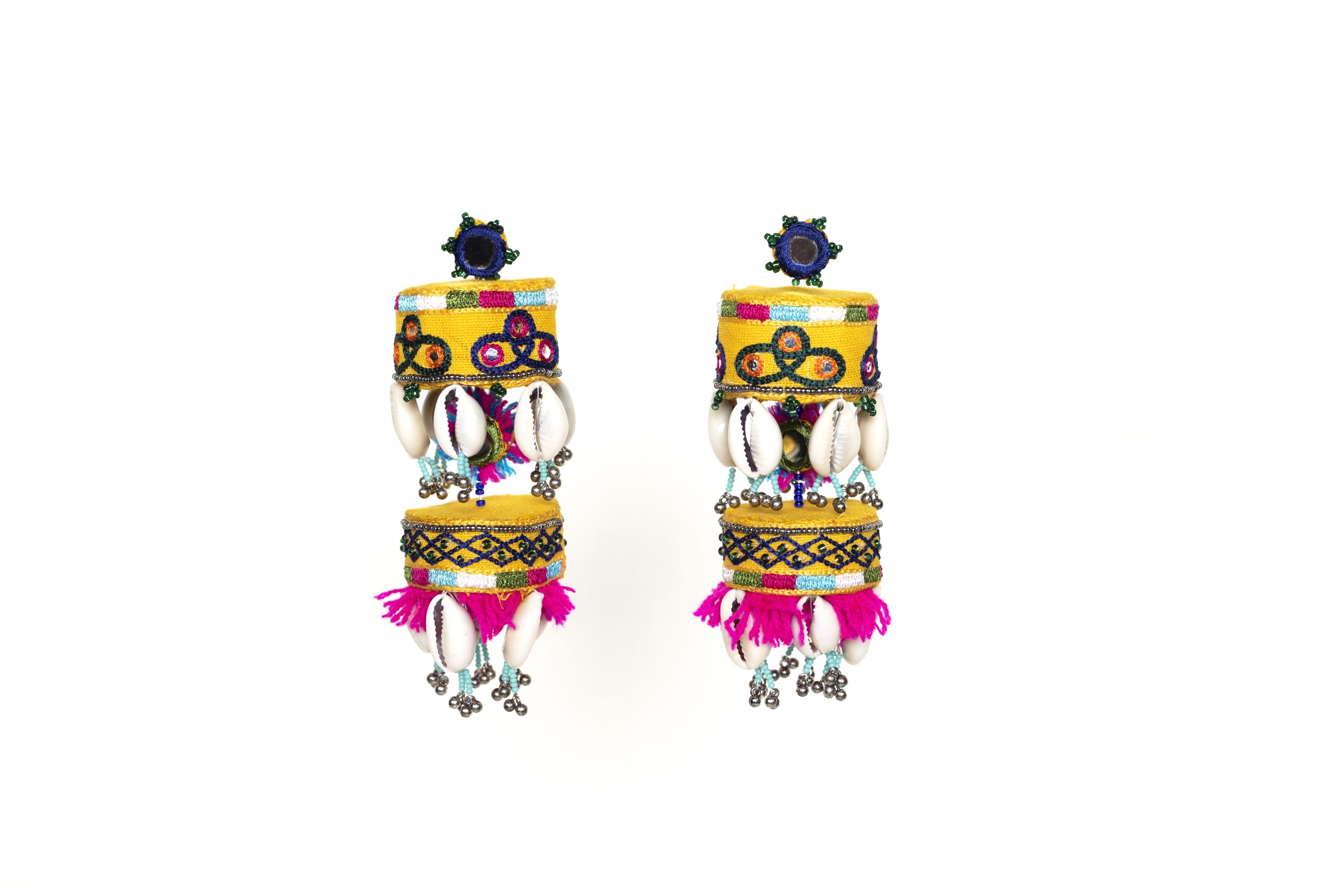 Exclusive handcrafted jhumka earrings with our traditional Indian motifs and kowri shell hanging, specially designed for Navratri and Durga Pooja festivals. Lightweight and easy to carry. Provided with a stud at the back.