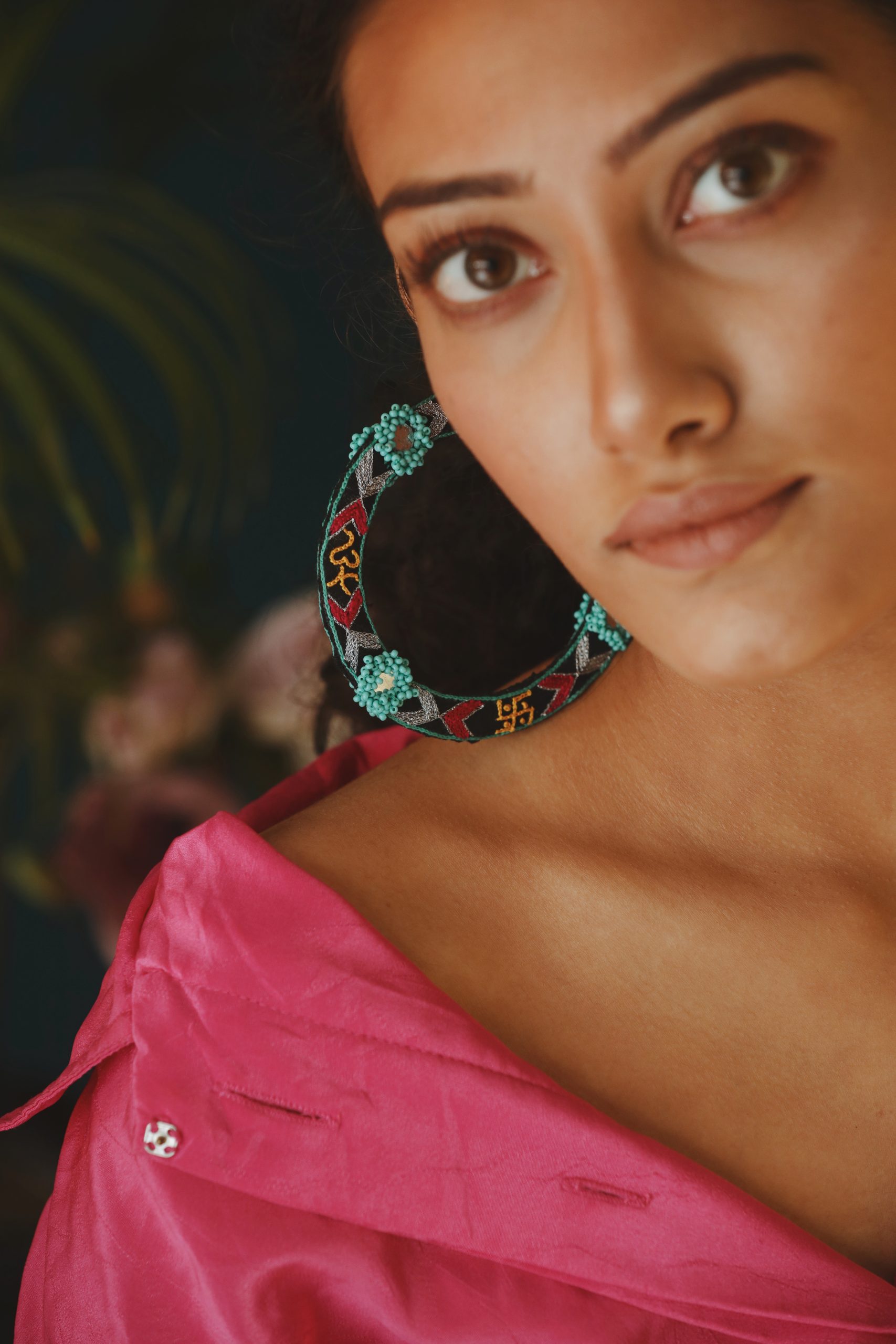 Handmade and hand-embroidered hoop earrings with silk thread embroidery and bead details. Earrings are embroidered on both sides. Lightweight and easy to carry.
