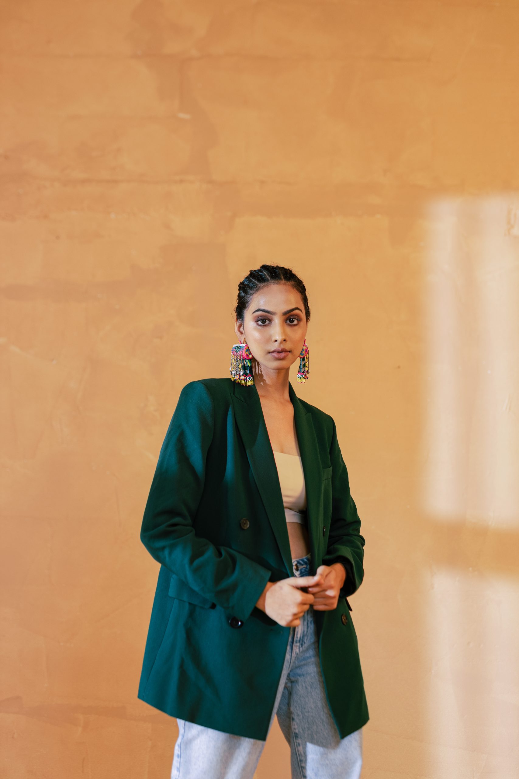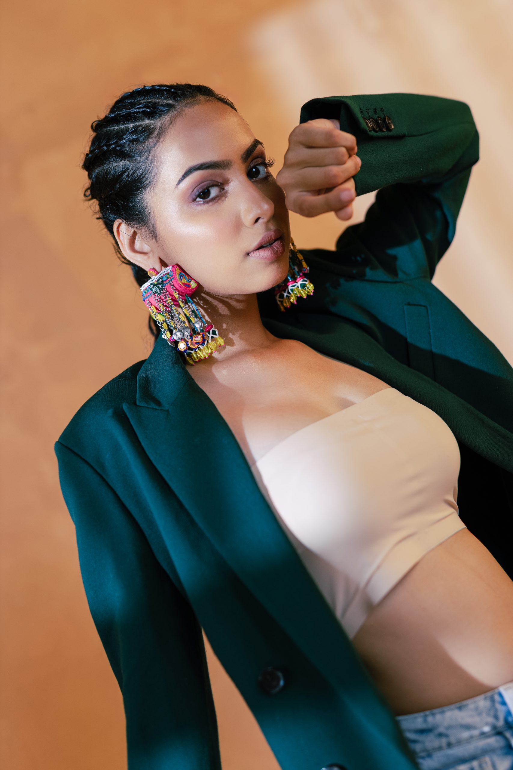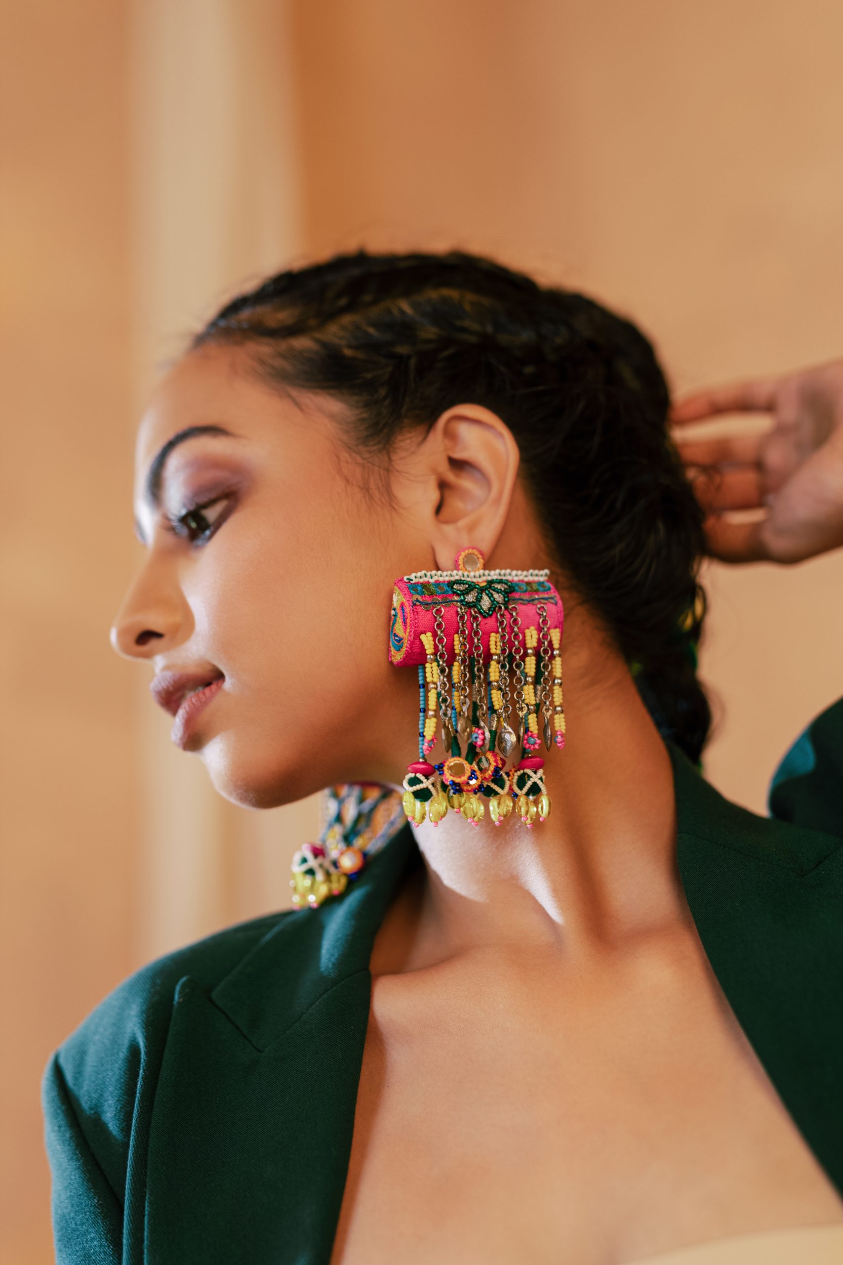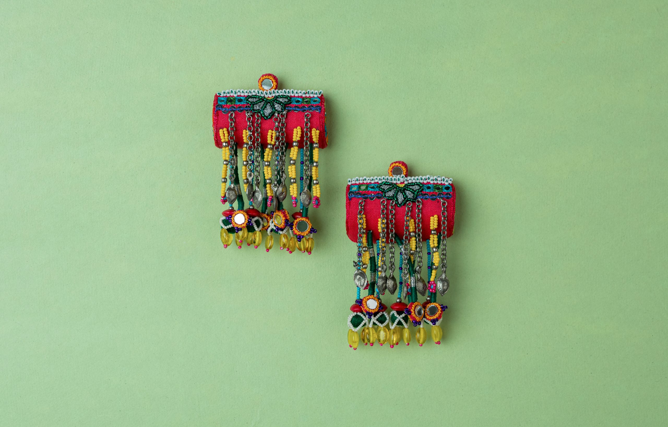 Introducing our Baggha! Pair with Peacock motifs embroidery, detailed with beads and oxidized metal hangings. A semi-cylindrical shape makes it the most unique of them all. Lightweight and easy to carry. Provided with a stud at the back.