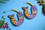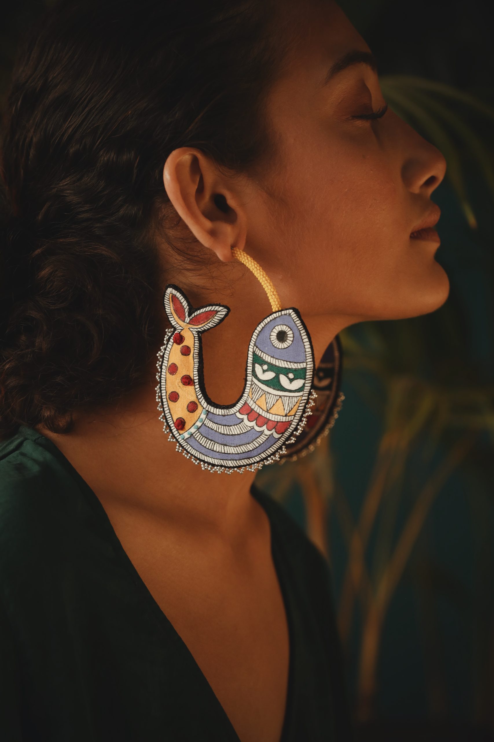 Handmade and hand-painted hoop earrings with our unique Madhubani fish design. Detailed with embroidery and beads. Painted on both sides. Lightweight and easy to carry.