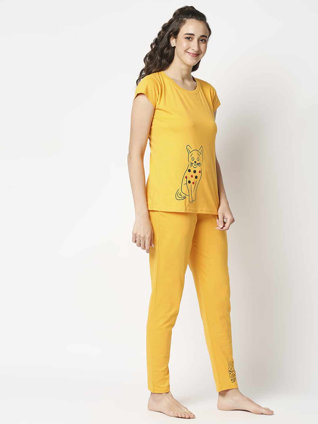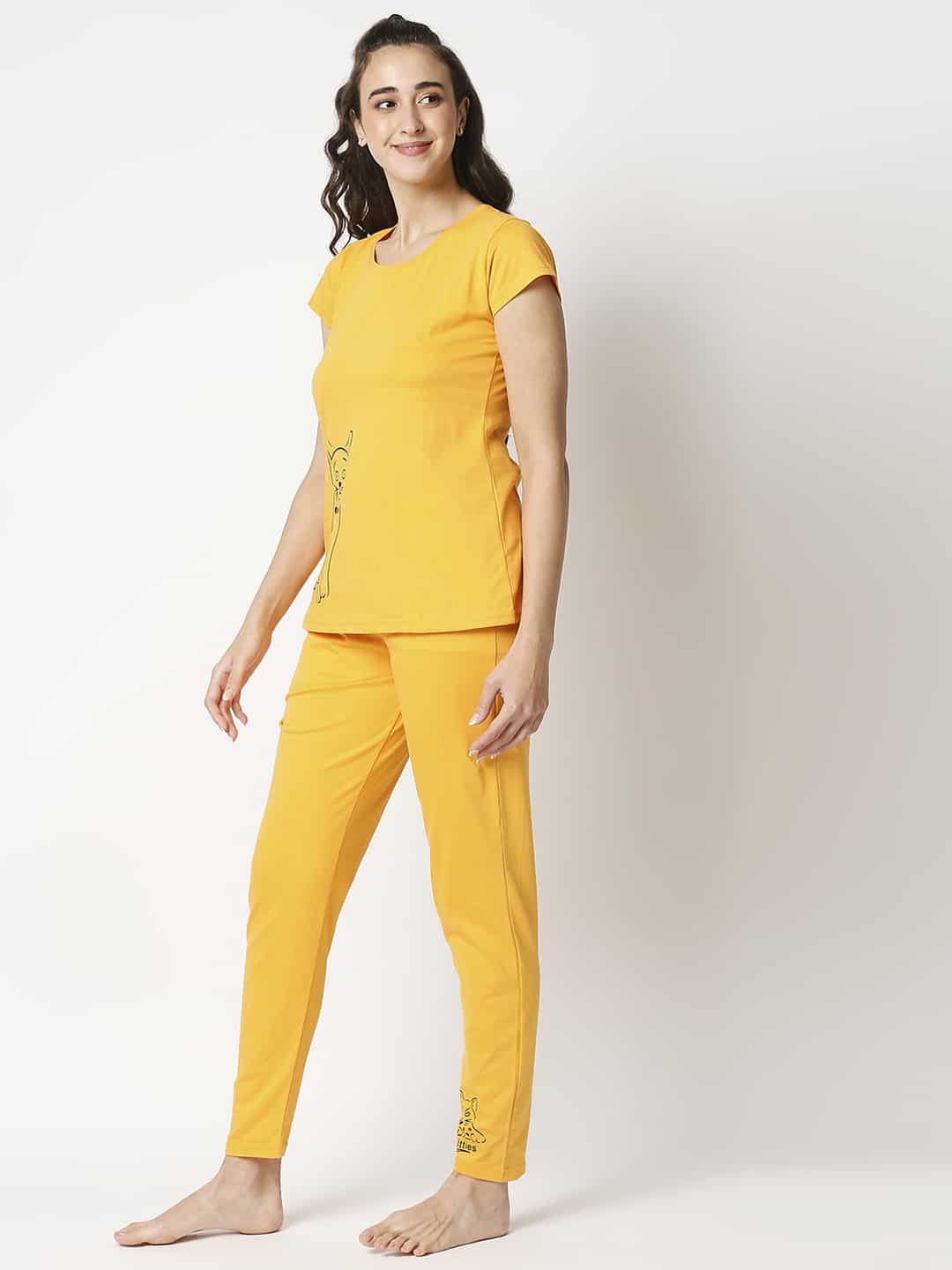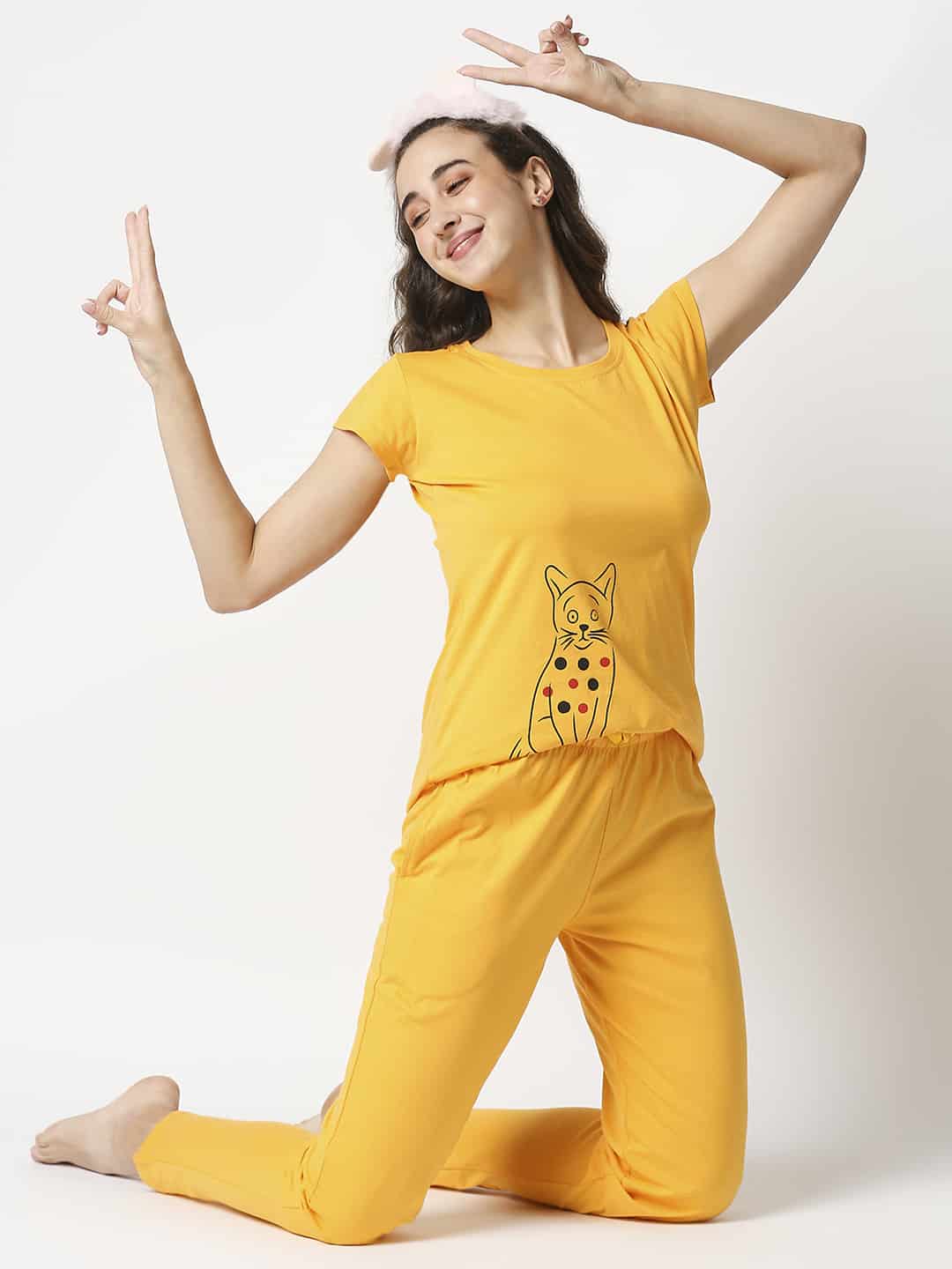 Treat yourself to a Night of sweet dreams in our pure organic cotton top & pyajama Set. Regular Fit. Pyajama bottom has a elasticated waist for your comfort. An all over print nightwear or an printed nightwear