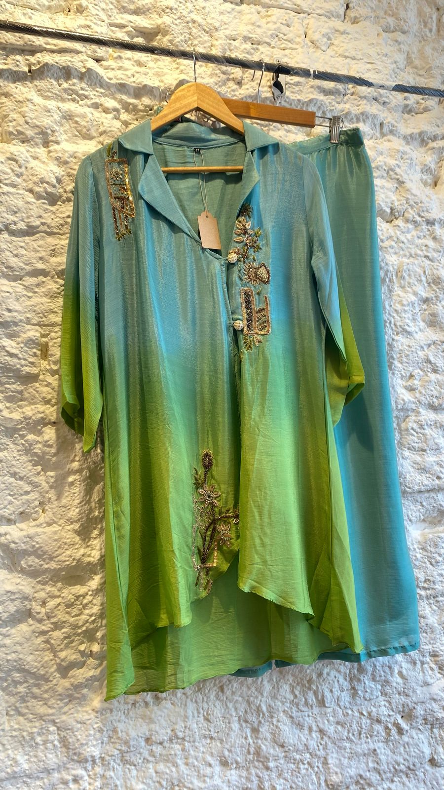 Make a bold yet breezy statement with our Tropical Dusk 2-Piece Co-ord Set. Designed in a fluid ombré blend of green and teal, this ensemble is highlighted with intricate gold embellishments that add just the right touch of glam. The relaxed-fit top with handcrafted details pairs effortlessly with wide-leg pants, creating a look that’s perfect for brunches, resort evenings, or festive get-togethers.